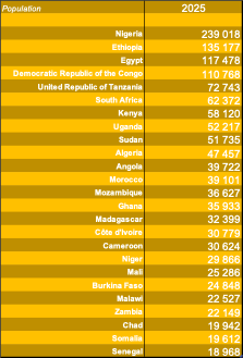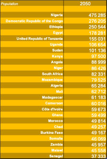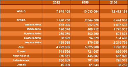 Sur le plan démographique, l’Afrique passera d’environ 1,4 milliard d’habitants aujourd’hui à près de 2,6 milliards en 2050. Cette dynamique, concentrée en Afrique subsaharienne — Nigeria, RDC, Éthiopie, Tanzanie — constitue à la fois un défi majeur de stabilité et le cœur de la croissance démographique mondiale à venir, dans un monde vieillissant.