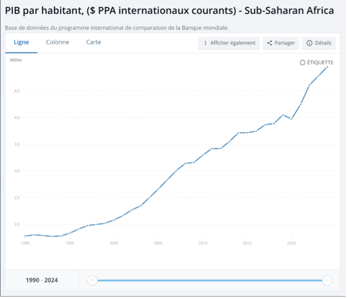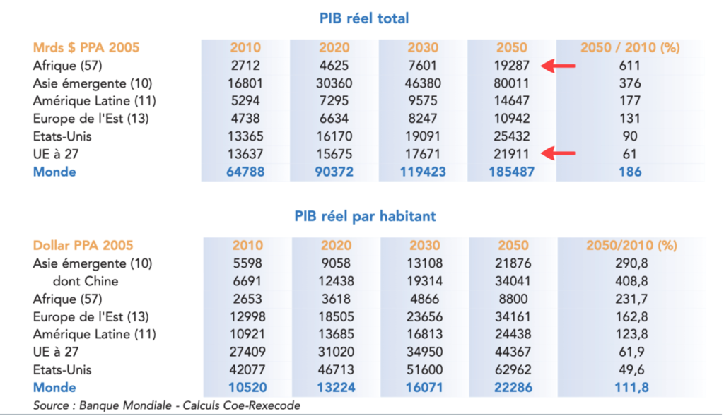 Sur le plan économique, le PIB réel par habitant en parité de pouvoir d’achat a plus que doublé depuis les années 1990, et le PIB réel total africain pourrait être multiplié par plus de six entre 2010 et 2050, à un rythme supérieur à celui de nombreuses autres régions du monde.