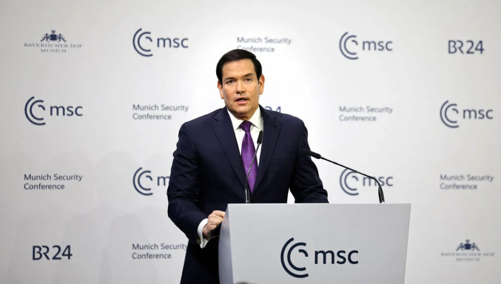A l’inverse du discours du vice-président JD Vance l’année dernière devant la même assemblée, le chef de la diplomatie américaine, Marco Rubio, a livré des propos plus diplomatiques, devant une assemblée de chefs d’État et de gouvernements européens plus soudés et plus volontaires dans leur volonté de vouloir « peser ». Rubio a appelé les Européens à se ranger derrière la vision de Donald Trump sur l’ordre mondial, tout en prônant la revitalisation du lien avec une Europe « forte ». Les États-Unis, sous Donald Trump, sont prêts à mener la « restauration » de l’ordre mondial, a-t-il poursuivi. Marco Rubio a assuré que les États-Unis souhaitaient « des alliés (…) qui comprennent que nous sommes les héritiers d’une même grande et noble civilisation et qui, avec nous, sont prêts et capables de la défendre …/… Nous ne cherchons pas à diviser, mais à revitaliser une vieille amitié », a-t-il affirmé. Si les États-Unis sont « prêts, si nécessaire, à agir seuls, nous préférons et espérons agir avec vous, nos amis ici en Europe », a-t-il précisé.